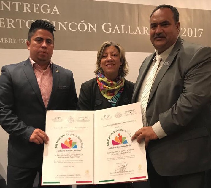 SOMBRERETE, ZAC.- Autoridades municiaples recibieron el distintivo «Gilberto Rincón Gallardo» 2017 a Presidencia Municipal Sombrerete por ser un gobierno que da oportunidades a personas con capacidades diferentes, con la finalidad de desempeñarse en un lugar de trabajo de acuerdo a sus habilidades.