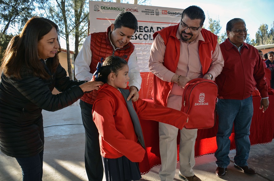 El presidente municipal enfatizó que la entrega de chamarras y mochilas, elaboradas por manos zacatecanas, es gracias a la voluntad del gobernador Alejandro Tello Cristerna, quien en los hechos refrenda su compromiso con la educación y a este objetivo se ha sumado el Ayuntamiento mediante el programa En Guadalupe Mejoramos tu Escuela.