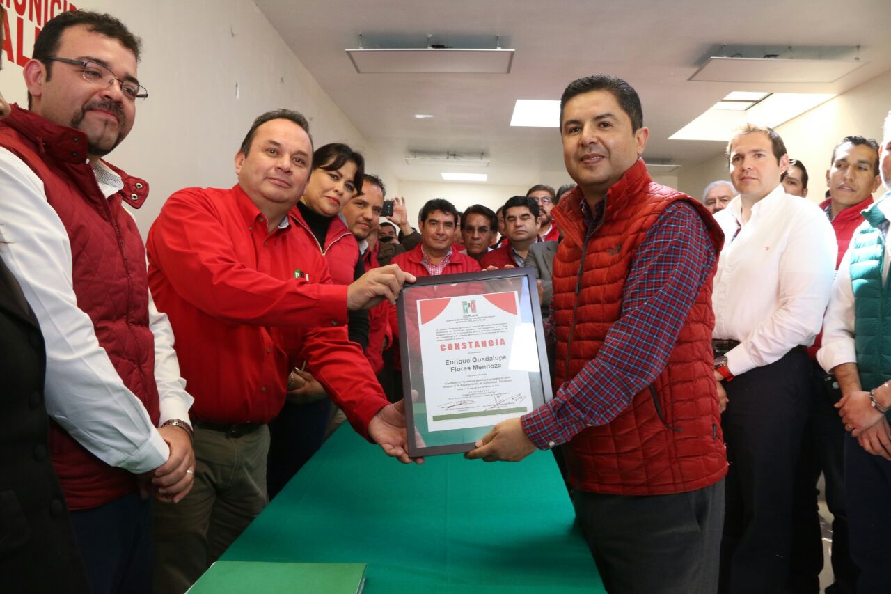 Guadalupe, Zacatecas.- Al recibir su constancia que lo acredita como candidato del Partido Revolucionario Institucional (PRI) a la presidencia municipal de Guadalupe, Enrique Guadalupe Flores Mendoza reconoció la unidad de los organismos que integran el tricolor para trabajar de la mano por un mejor Guadalupe.