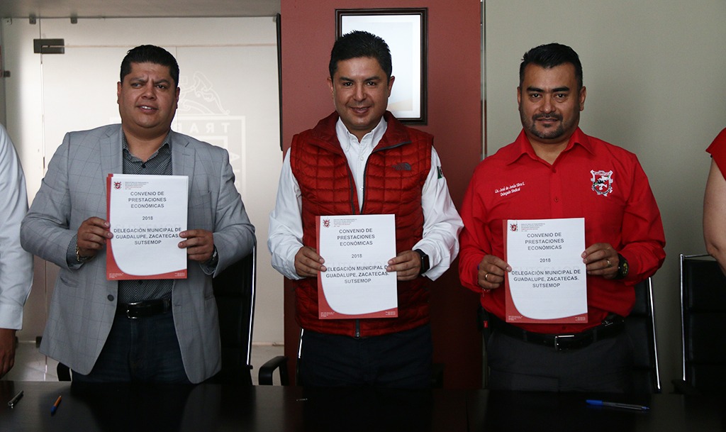 Guadalupe, Zacatecas.- Como muestra del compromiso para con la base trabajadora, el alcalde Enrique Guadalupe Flores Mendoza y Miguel Ángel Toribio Bañuelos, secretario general del Sindicato Único de Trabajadores al Servicio del Estado, Municipios y Organismos Paraestatales (SUTSEMOP) firmaron el acuerdo para otorgar un incremento salarial del 5% a los más de dos mil trabajadores sindicalizados y de confianza del Ayuntamiento de Guadalupe.