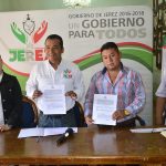 El profesor Fernando Enrique Uc Jacobo, acompañado por la sindica Yesenia Soriano Barrios, Elizabeth Murillo directora de Desarrollo Económico y Social, Martin de Jesús Sotelo Montelongo encargado del área de Atención al Migrante, firmó el convenio “Acortando Distancias” con los empresarios Misael Martínez García representante legal y Cayetano Martínez Serapio director operativo de la empresa Autobuses Jerezanos.