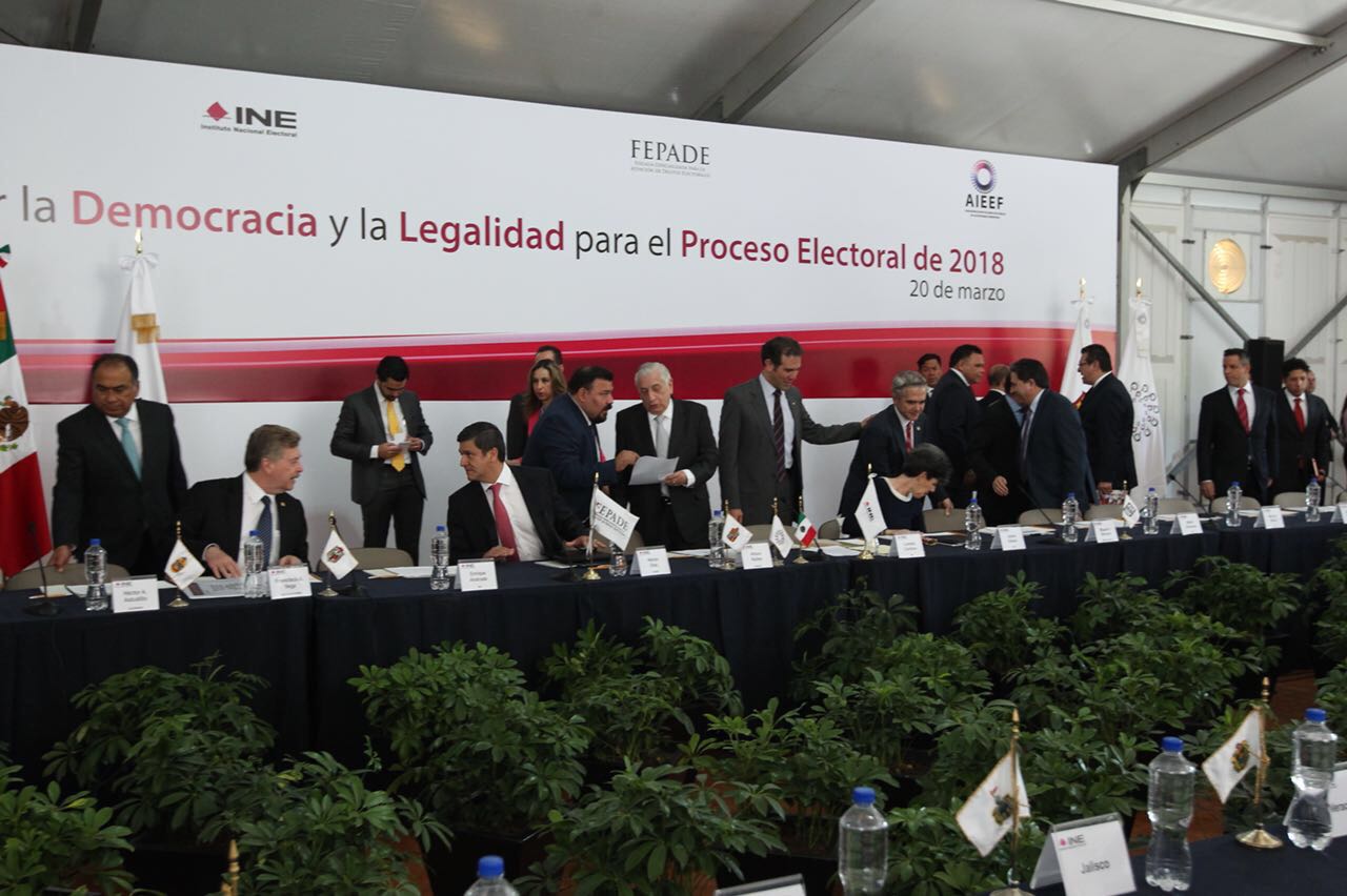El Instituto Nacional Electoral (INE) y la Conferencia Nacional de Gobernadores (CONAGO), junto con autoridades electorales federales y estatales, firmaron hoy la Declaración por la Democracia y la Legalidad para el Proceso Electoral 2018, como un compromiso público para que las elecciones del 1 de julio, se realicen en paz, con legalidad, transparencia y al margen de influencias indebidas.