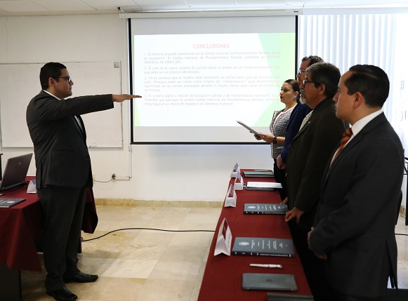 Reunidos en el Salón de Usos Múltiples del Juzgado de Control y Tribunal de Enjuiciamiento del Distrito Judicial de la Capital del Poder Judicial del Estado y en presencia del Magistrado Presidente, Armando Ávalos Arellano y del Doctor Raúl Carillo del Muro, Director de la Escuela Judicial, así como de los miembros del jurado integrado por la Doctora Jenny González Arenas, Doctor José Enciso Contreras y el Doctor Raúl Federico García Pérez, escucharon la tesis expuesta por el funcionario judicial.