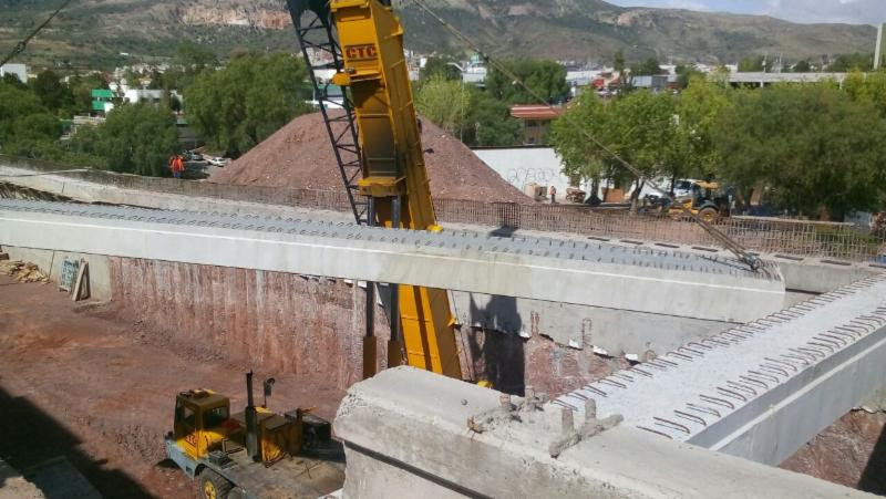 Los trabajos de construcción en el paso inferior vehicular avenidas Pedro Coronel – México registran, a la fecha, 70 por ciento de avance, y ya inició la colocación de trabes para dar sustento a la losa ubicada en la parte superior sobre la avenida México, donde circularán los vehículos.