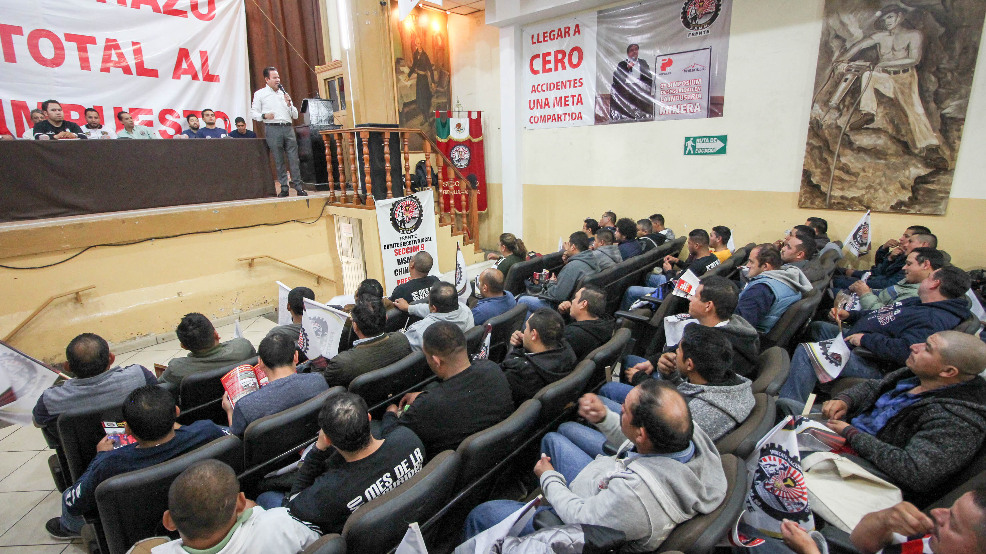 Benjamín Medrano, fue acompañado por el Candidato a Diputado Local, Erik Muñoz quien dirigió un mensaje a los mineros reunidos en el Teatro Primero de Mayo, a quienes expuso sus propuesta.
