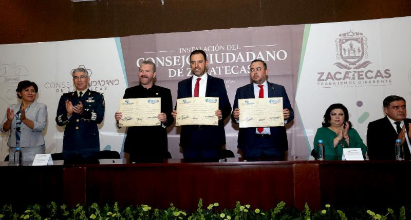 El Consejo Ciudadano instalado por el Gobernador en Zacatecas lo conforman Alejandro Enríquez Suárez del Real, presidente de la Coparmex en Zacatecas; Alfredo de Alba, del Instituto Tecnológico de Monterrery; Carlos Gabriel López, de la Universidad de la Vera – Cruz y Sonia de Jesús Celaya, de la Universidad Interamericana para el Desarrollo.