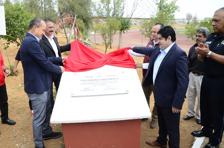 Luego del protocolo de la ceremonia en la que se le entregó un reconocimiento, Efraín Flores y Samuel Díaz develaron una placa que se ubica a la entrada de la cancha con la siguiente leyenda.