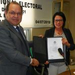 Fresnillo, Zac.- Mirna Maldonado Tapia, candidata a diputada federal electa, por el Distrito 1 de la coalición Juntos Haremos Historia, recibió la constancia de Mayoría Relativa de manos del consejero presidente del Instituto Nacional Electoral (INE) Distrito, Raúl Cuevas Quezada.