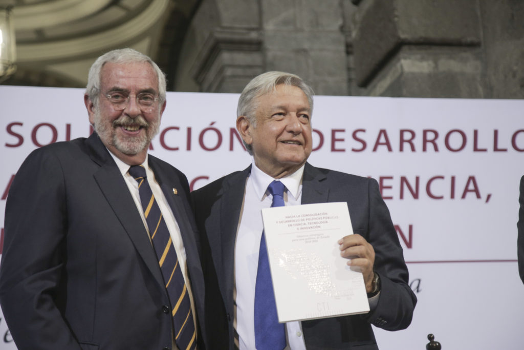 Al principio López Obrador recibió de manos del rector de la Universidad Nacional Autónoma de México, Enrique Graue Wiechers el documento titulado: “Hacia la Consolidación y Desarrollo de Políticas Públicas en Ciencia, Tecnología e Innovación. Objetivo Estratégico para una Política de Estado 2018-2024”.