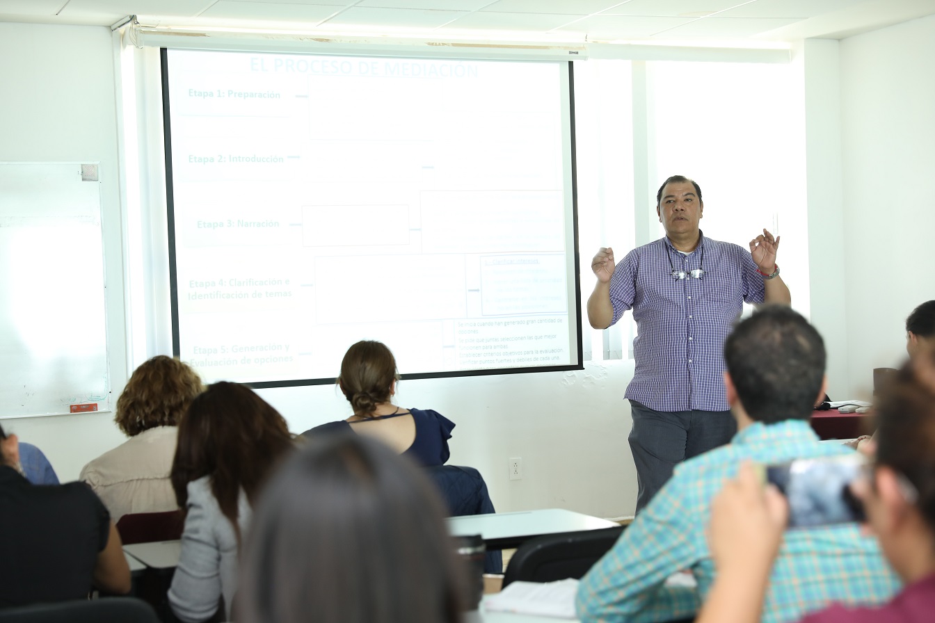 Héctor Ivan Jiménez Esponda, destacó que la sensibilización hacia todo aquel que va a aplicar la Justicia Alternativa tiene que ver con el aprendizaje, desarrollo y aplicación de técnicas y herramientas que coadyuven a la comunicación, evitando juzgar y etiquetar a los usuarios, a fin de no imponer resoluciones, sino, siendo partícipes del diálogo entre las partes, es decir, mediar a través de la generación de puentes entre las opiniones para sanar los conflictos.
