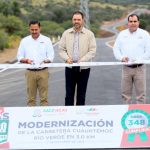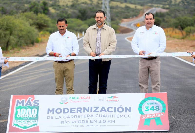 Asimismo, entregó la modernización de 3 kilómetros de la carreta Cuauhtémoc-Río Verde, en la cual se invirtieron más de 9 millones de pesos para convertirla de un camino rural a una carretera pavimentada, mediante la construcción de terracerías y carpeta asfáltica, obras de drenaje y cunetas.