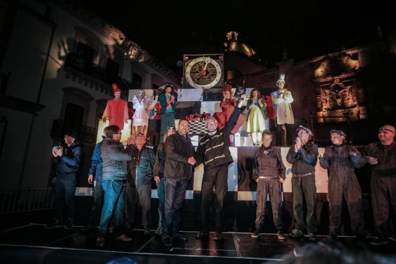Acompañado de Alfonso Vázquez Sosa, director general del Instituto Zacatecano de Cultura (IZC) «Ramón López Velarde», el Gobernadot Tello subió a uno de los cuadros montados, donde culmina la obra, para reconocer el talento de los actores y agradecer a los zacatecanos su asistencia al Festival, en éste y otros escenarios.