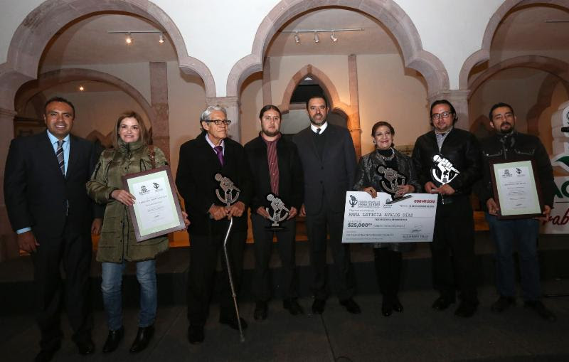 Alejandro Tello entregó el Premio Estatal de Periodismo Sergio Candelas Villalba 2018 a Martín Catalán Lerma, de La Jornada Zacatecas, y Manuel López Frausto, de Zacatecas Online, quienes ganaron en las categorías de Prensa Escrita y Medios Digitales, respectivamente.