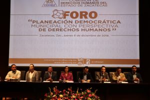 El foro se desarrolló con las ponencias «La promoción, respeto, protección y garantía de derechos humanos en el ejercicio de la administración municipal» a cargo del Dr. José Zamora Grant, Docente Investigador de la Universidad Autónoma de Tlaxcala, e investigador invitado del Instituto Nacional de Ciencias Penales (INACIPE); «Federalismo, Desarrollo Municipal y Derechos Humanos» impartida por la Mtra. Nancy Bernal Zetina, Directora de Desarrollo del Federalismo (INAFED) de la SEGOB; así como «Planeación democrática y presupuestación municipal con perspectiva de derechos humanos», otorgada por el Mtro. Israel Guerrero de la Rosa, Director Ejecutivo del Comité de Planeación y Desarrollo de Zacatecas (COPLADEZ).