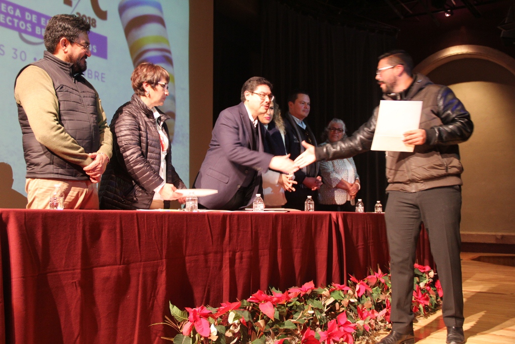 Posteriormente se hizo entrega de manera simbólica a nueve beneficiarios de proyectos ganadores, tal ese el caso del proyecto Danza Infantil de Caballitos, de Leticia Almaráz; Sones de Mezquital, de Uriel Medina; Las Señoras de la Costura, de Eva Gómez y Danza e Matachines de San Isidro Labrador, de Homero Ramos.