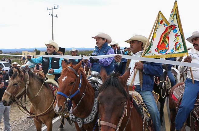 Así mismo al arribar a la localidad dio por inaugurado el tramo carretero Tasajera-Palmilla, reiterando su compromiso de continuar trabajando por el desarrollo de Mazapil.