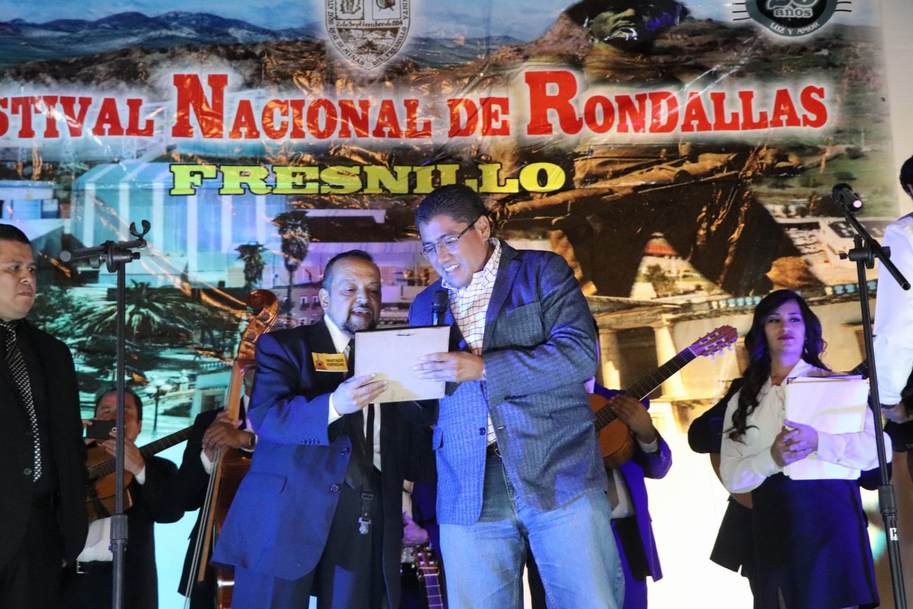 Entrego reconocimientos por su participación a las rondallas Cenzontle, de la ciudad de Puebla y a las Rondallas Zorzal y Romances, ambas de Jalapa Veracruz y asimismo, reiteró su agradecimiento a las seis rondallas asistentes del municipio de Fresnillo, quienes a través de los años mantienen viva esta tradición musical, para pasar la estafeta a las nuevas generaciones, representadas entre otros, por los jóvenes integrantes de la Rondalla del Colegio Fresnillo.
