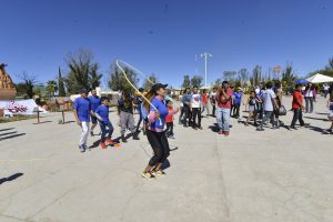 Después subieron a un brincolín con forma de montaña, lo atravesaron, más adelante estaba un tambo con agua, con un bote pequeño llenaron un recipiente de un litro, para ello los participantes pasaban el vaso más pequeño encima de su cabeza.