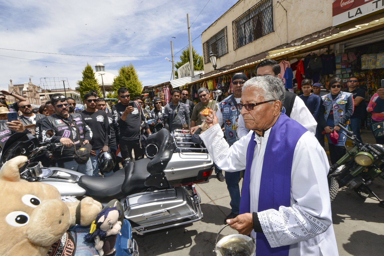 Fresnillo Zac.- Cientos de motociclistas del Club de Motociclismo Arlequines e invitados se concentraron en Fresnillo, donde convivieron en la Presa de Rivera, comieron en el Centro de Convenciones Fresnillo y asistieron a Plateros a la ceremonia religiosa de bendición de cascos, para desfilar en la tarde noche por el centro de la ciudad.