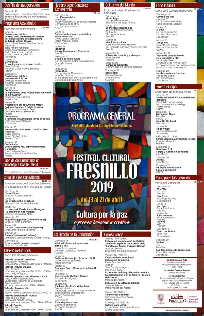 Fresnillo, Zac.- Los Gobiernos del Estado y Fresnillo a través de los Institutos Municipal de Cultura (IMC) y “Ramón López Velarde” del Estado de Zacatecas, presentan más de 60 actividades con la participación de siete Estados de la República Mexicana, dentro del “Festival Cultural Fresnillo 2019”, bajo el eslogan “Cultura Por la Paz”.