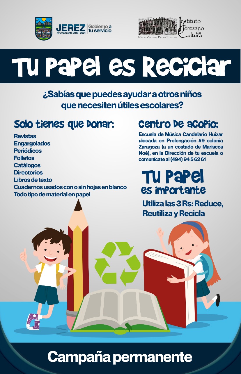 Con la campaña Tu Papel es Reciclar, el Gobierno Municipal a través del Instituto Jerezano de Cultura (IJC) invitan a la ciudadanía a donar todo tipo de material en papel que pueda ser reciclado para beneficiar a estudiantes con la entrega de útiles escolares.