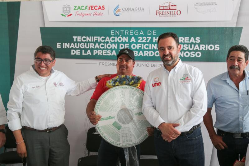 El Gobernador Alejandro Tello, en compañía del alcalde de Fresnillo, Saúl Monreal, el gerente estatal de la Comisión Nacional del Agua (Conagua), Héctor González, y el Secretario del Campo, Adolfo Bonilla, entregaron esta obra que requirió de una inversión de 9.3 millones de pesos, convenidos entre el estado, la Federación y los usuarios.