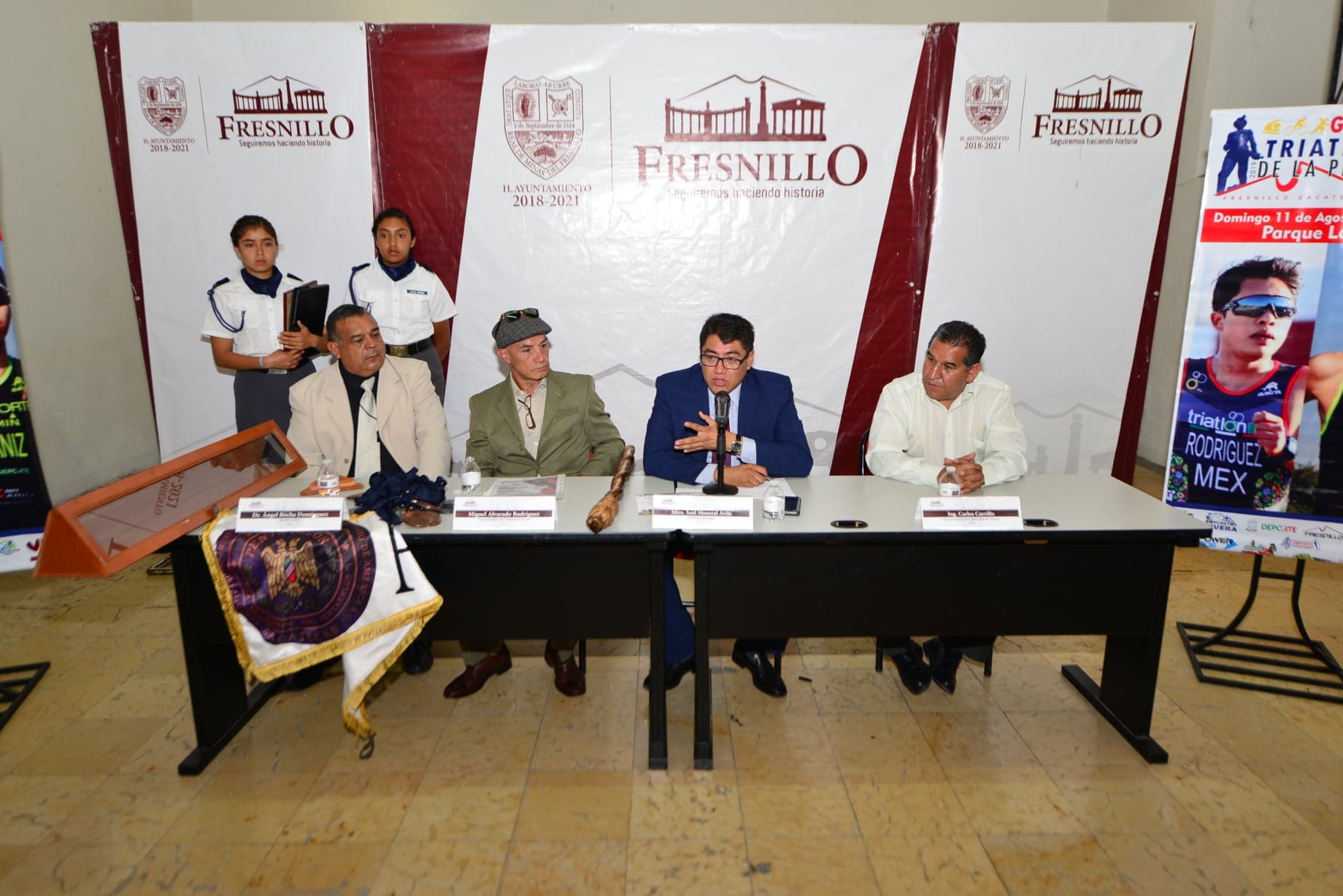 Fresnillo., Zac.- En la tradicional conferencia de prensa de los lunes, el Alcalde Saúl Monreal Ávila, presentó el cartel del Gran Triatlón de la Plata en su quinceava edición, que se realizará el próximo 11 de agosto en el parque Los Jales.