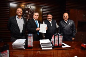 El Presidente de la Comisión de Régimen Interno y Concertación Política (CRIP) de la Legislatura, José María González Nava recibió la iniciativa de presupuesto, acto que fue atestiguado por el Presidente de la Comisión de Planeación Patrimonio y Finanzas (PPF), Armando Perales Gándara y el Secretario General de la Legislatura, Le Roy Barragán Ocampo.