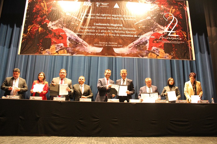 Posteriormente, se llevó a cabo la firma de dos Convenios de Colaboración Institucional, por un lado, entre el Tribunal de Justicia Electoral del Estado de Zacatecas, el Instituto Electoral del Estado de Zacatecas, el Instituto Nacional Electoral y las Universidades Autónomas de Zacatecas y Durango, campus Zacatecas.