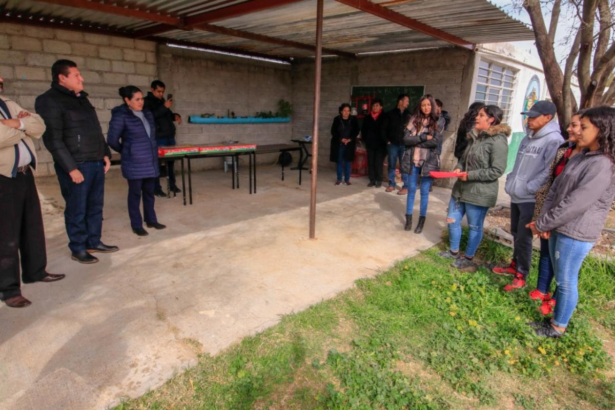 Adolfo Suárez Rocha, director del CBTA, informó de la producción de fresa y jitomate en el macro túnel; del tanque de geomembrana con una capacidad de 50 mil litros, de la granja avícola con 10 paquetes de aves, huertos familiares, 90 postes y rollos de alambre.