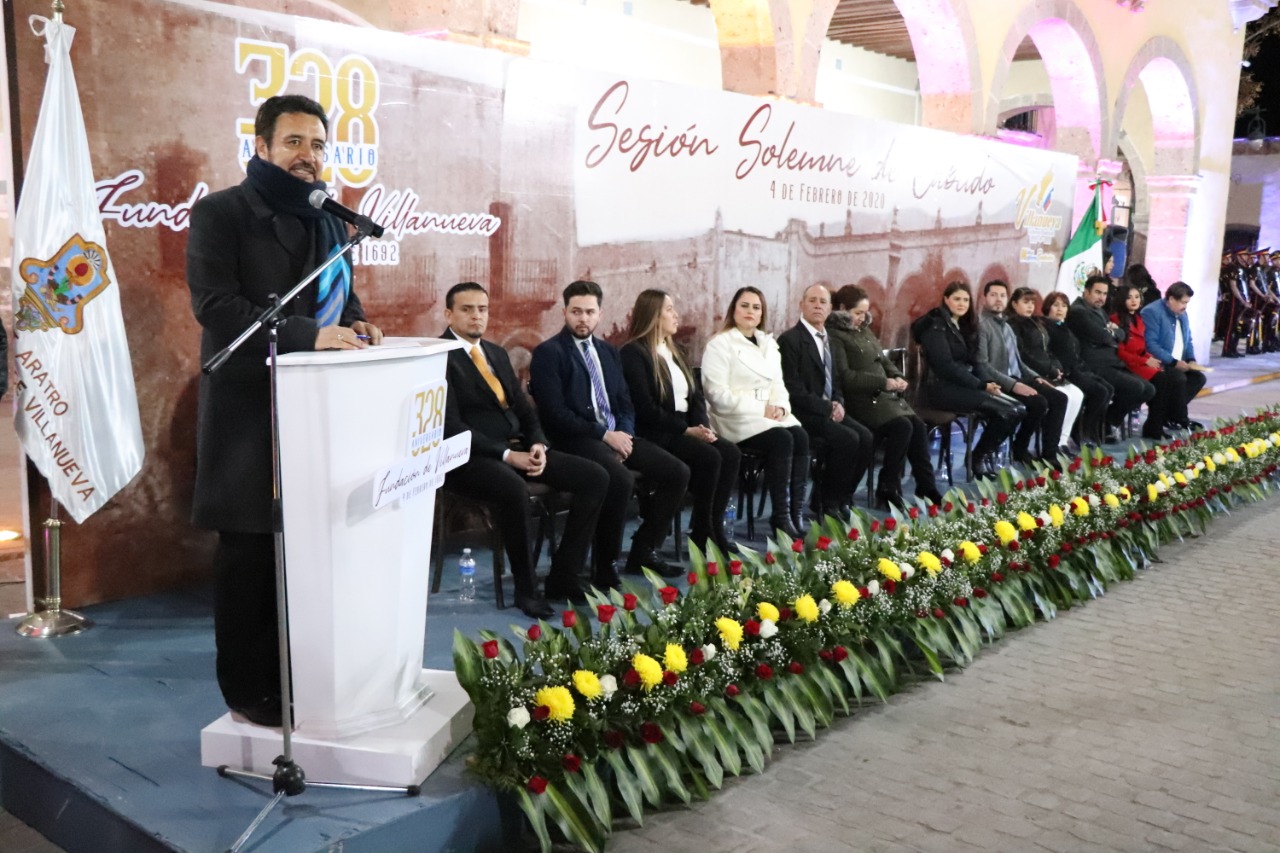 Con sesión solemne de cabildo, este martes 4 de febrero se conmemoró el aniversario 328 de la fundación de Villanueva. Al dar el pase de lista y estar presentes 9 de los 10 regidores, la síndico municipal María Guadalupe Salas y el secretario del ayuntamiento Salvador Núñez se conformó el quórum legal y se instaló la sesión a cargo del alcalde Torres Rosales.