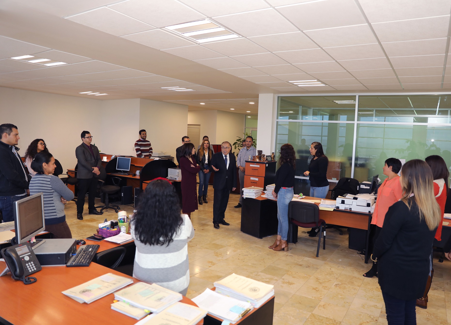 Posteriormente, el Magistrado Nahle fue recibido en el área administrativa, donde platicó de manera cercana con el personal que conforma este órgano: jueces especializados, administrativos de acta, encargados de causa, notificadores y jóvenes meritorios.