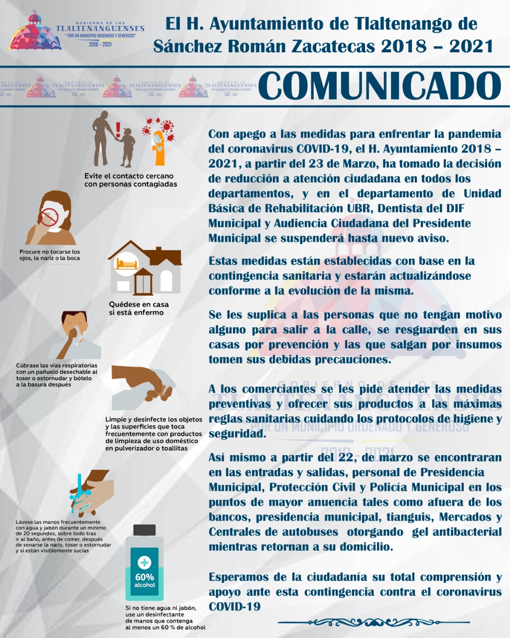 TLALTENANGO,ZAC.- Debido a la prevención de la salud de los ciudadanos que por algún motivo siguen transitando en los lugares como bancos, presidencia municipal, tianguis, Mercados y Centrales de autobuses se encontraran en las entradas y salidas, personal de Presidencia Municipal, Protección Civil y Policía Municipal en los puntos de mayor anuencia otorgando gel antibacterial mientras retornan a su domicilio, invitarlos a que si no tienen que salir se queden en su casa así es una de las forma de combatir el COVID-19