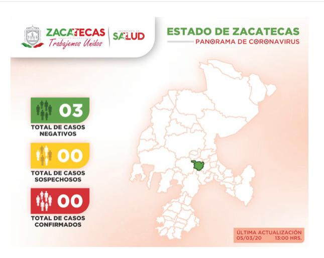 La Secretaría de Salud de Zacatecas (SSZ) obtuvo resultados negativos a las pruebas realizadas a dos pacientes sospechosos de ser portadores del coronavirus COVID-19, luego de habérseles tomado las muestras correspondientes y haberse analizado en el Laboratorio Estatal de Salud Pública (LESP).