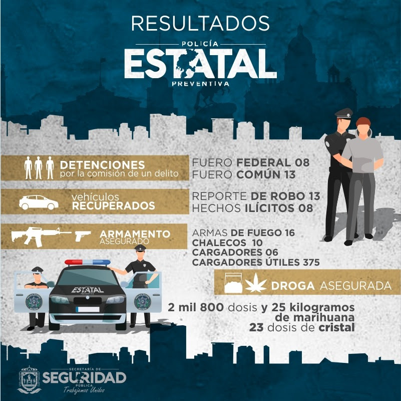 Del 20 al 26 de abril, integrantes de la Policía Estatal Preventiva (PEP) y la Policía Metropolitana (Metropol) detuvieron a 35 personas por estar relacionadas con la comisión de algún delito, aseguraron 20 armas de fuego, 2 mil 800 dosis de droga y más de 350 cartuchos útiles.