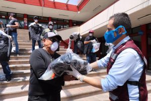 Cumpliendo con las medidas preventivas por la emergencia sanitaria del Coronavirus COVID-19, fue en el patio central de la Presidencia Municipal donde el primer edil hizo entrega de paquetes de chamarras, lámparas, gorras, silbatos; además de un kit de sanidad que incluye gel alcoholado, cubrebocas y guantes látex así como despensas para sus familias.
