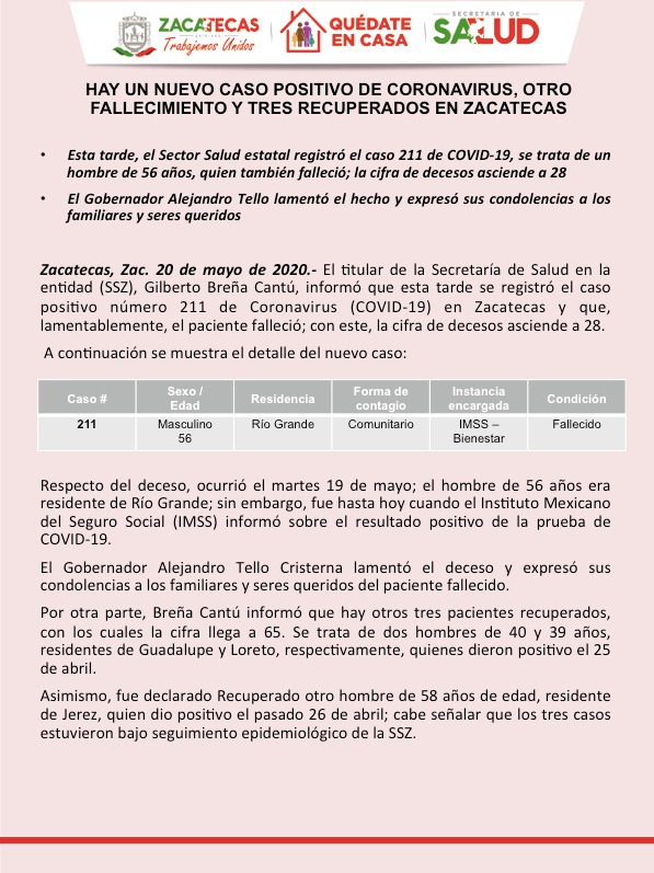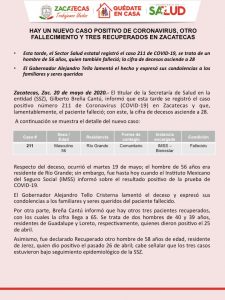 3 Nuevos Recuperados, 1 Positivo y 1 Deceso Por COVID 19