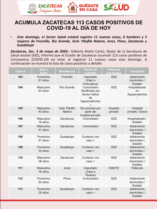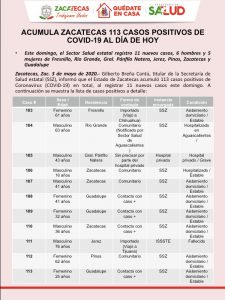 Acumula Zacatecas 113 Casos Positivos de COVID 19.