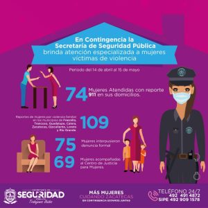 La Secretaría de Seguridad Pública trabaja en coordinación con otras áreas del Gobierno del Estado en el programa En Contingencia Estamos Juntas, lo que ha permitido que la unidad especializada atendiera directamente a 74 mujeres en sus domicilios, del 14 de abril al 15 de Mayo, producto de reportes a través del Sistema de Emergencia 911.
