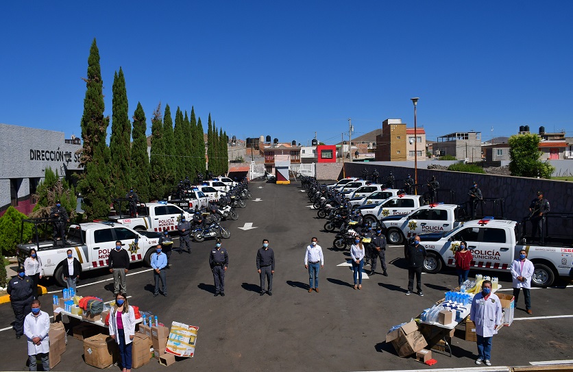 El equipo entregado se refiere a 7 patrullas RAM, 6 motocicletas, y equipo de protección personal como caretas, guantes, cubrebocas KN95, googles, overoles, sanitizantes, termómetros digitales, jabón antibacterial, batas, desinfectante en aerosol, entre otros.
