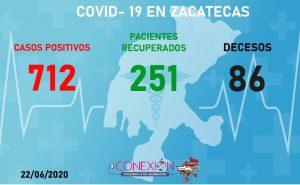 Zacatecas sumó un total de 712 casos positivos de Coronavirus (COVID-19), al registrar, este día, 22 nuevos contagios; mientras que la cifra de fallecimientos aumentó a 86, con dos decesos registrados hoy, según lo dado a conocer por Gilberto Breña Cantú, titular de la Secretaría de Salud estatal (SSZ).