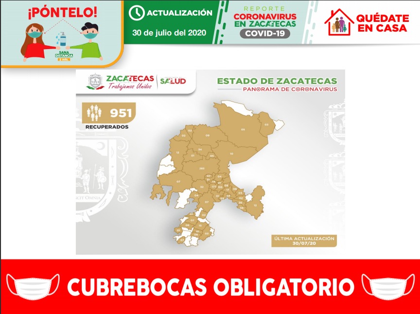 La Secretaría de Salud de Zacatecas (SSZ) registró, este jueves 30 de julio, a nueve pacientes recuperados clínicamente de Coronavirus (COVID-19) y suman ya 951 en el territorio estatal.