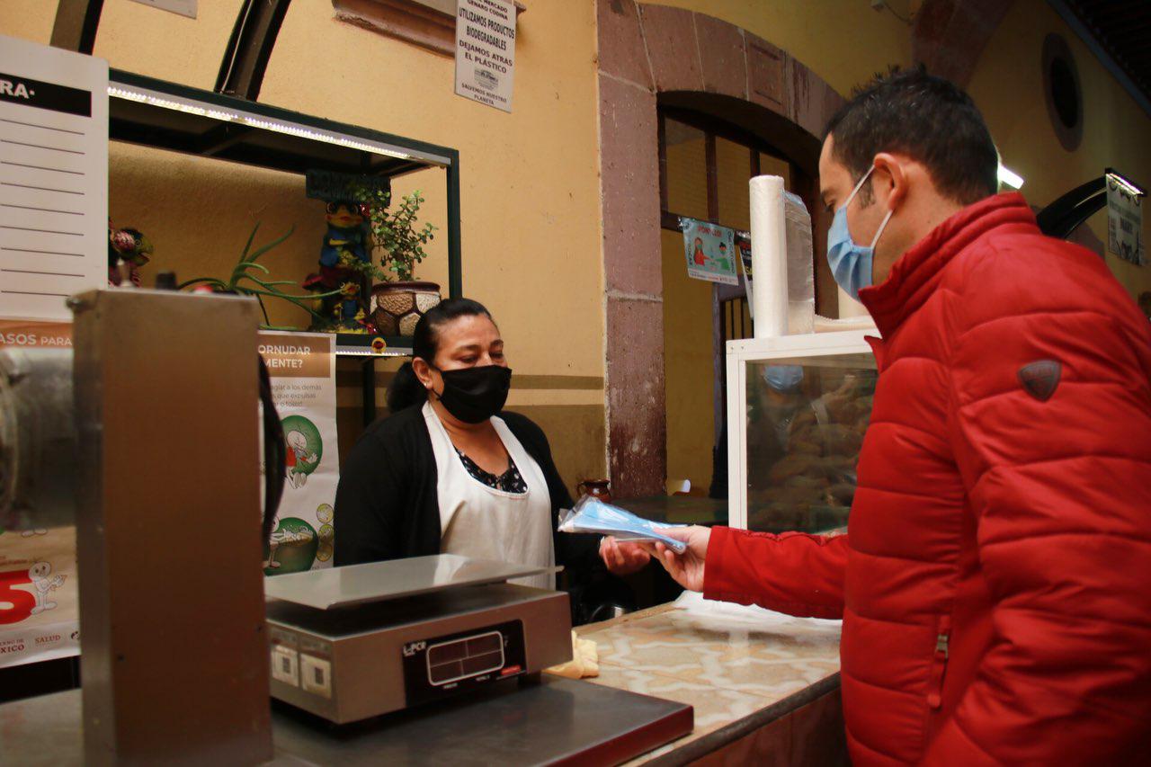 Dando puntual seguimiento a la campaña de prevención y promoción de la salud ante la contingencia por COVID-19, el alcalde capitalino Ulises Mejía Haro visitó las instalaciones del mercado Genaro Codina, mejor conocido como “El Laberinto”, haciendo entrega de apoyos económicos y cubrebocas a los locatarios y verificando el estricto cumplimiento de los protocolos de prevención.