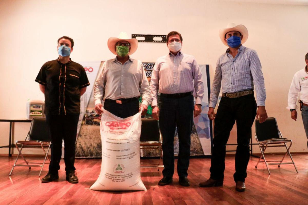 En total, el Secretario del Campo entregó insumos para la producción forrajera a 311 beneficiarios del Teúl de González Ortega; así como cercos perimetrales, horas máquina, urea, semilla de maíz, llantas para tractor y sementales bovinos a 565 productores de Tlaltenango, y fertilizante y semilla a 174 productores de Atolinga.