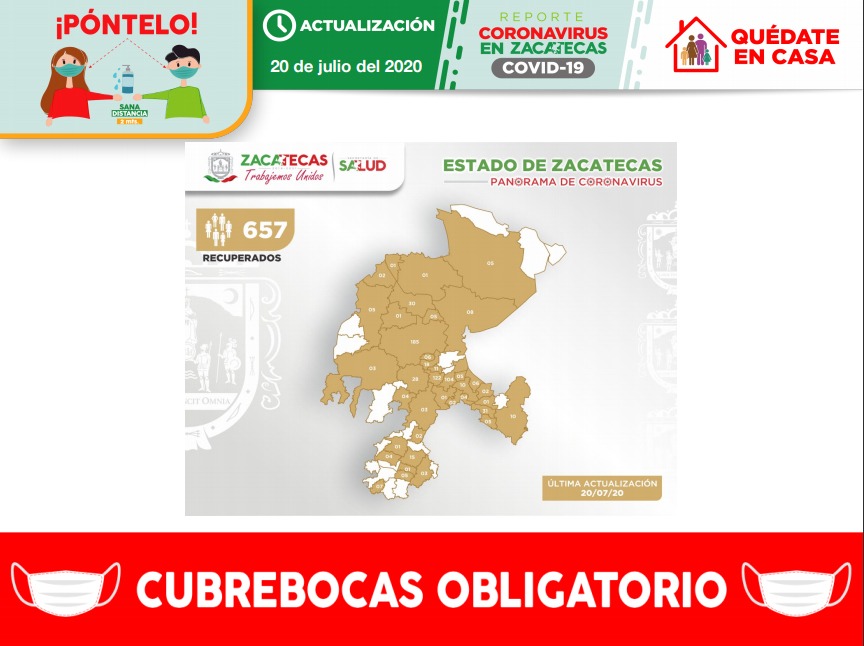 La Secretaría de Salud de Zacatecas (SSZ) registró, este lunes 20 de julio, a otros 29 pacientes recuperados clínicamente de Coronavirus (COVID-19), con los que suman ya 657 en la entidad.