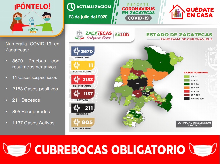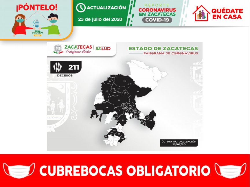Hasta la fecha, agregó, la actual pandemia ha dejado un total de 211 decesos en la entidad, siendo las últimas víctimas habitantes de los municipios de Pánfilo Natera, Nochistlán, Pinos, Fresnillo y Zacatecas.
