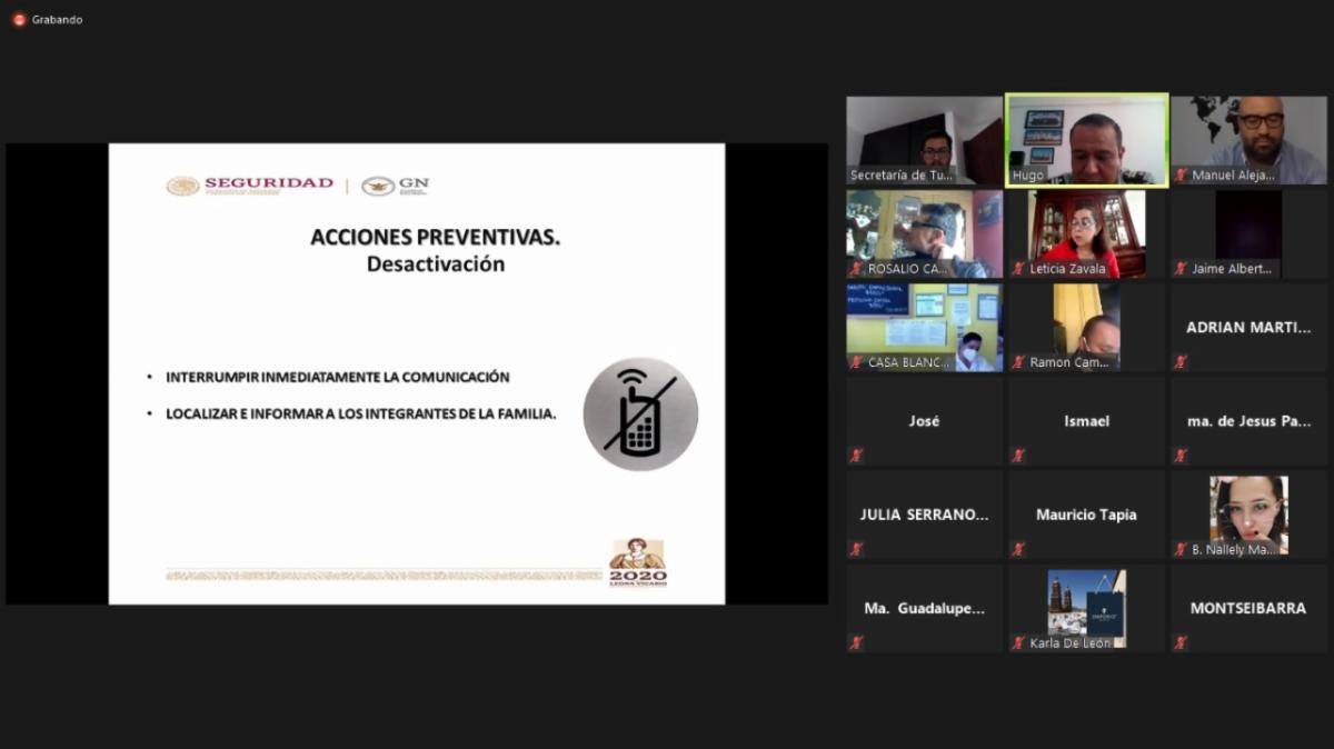 La Secretaría de Turismo (Secturz) y la delegación Zacatecas de la Guardia Nacional trabajan en la prevención de extorsión telefónica con el gremio de hospedaje de Zacatecas Deslumbrante. A través de dos capacitaciones en línea, han participado 131 personas.