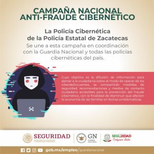 A través de la Estrategia Nacional, de la que la SSP de Zacatecas es parte, y en coordinación con la Guardia Nacional, buscan la máxima difusión del modus operandi, medidas de seguridad, recomendaciones y medios de contacto ciudadano para la prevención de este delito y disminuir las afectaciones sociales y económicas a la población.