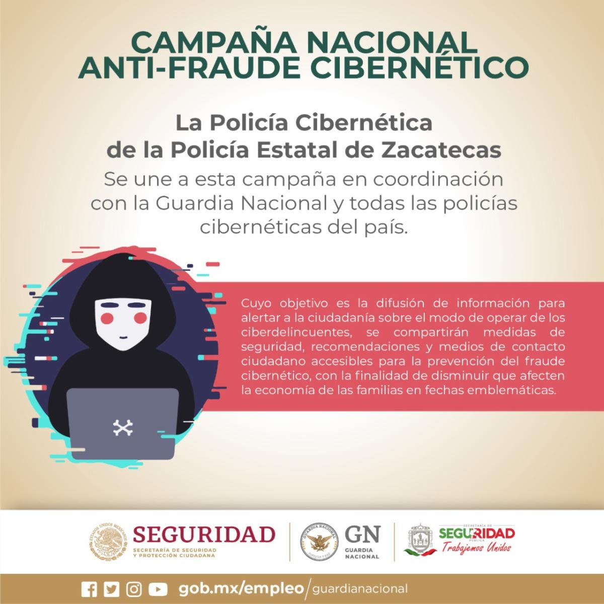 En el marco de la Estrategia de Seguridad Pública Integral para Zacatecas (ESPIZ), la División Científica, a través de la Policía Cibernética de la Secretaría de Seguridad Pública (SSP) participa en la Campaña Nacional Anti-fraude Cibernético que inició el 1 de noviembre y concluirá el 31 de enero de 2021.