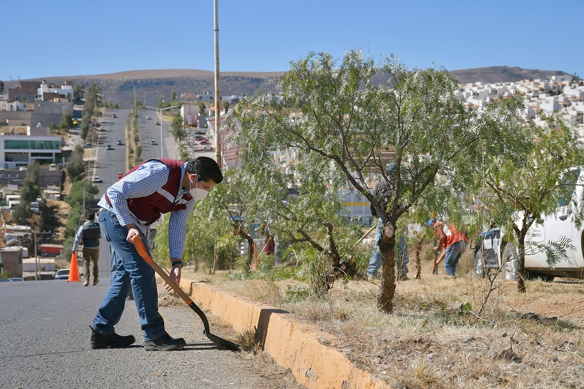 El alcalde de Guadalupe, Julio César Chávez, supervisó las acciones de limpieza y deshierbe en los camellones centrales y laterales de la vialidad San Simón.